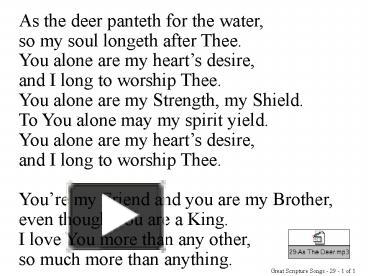 As The Deer - Female version (with lyrics), As the deer panteth for the water So my soul longs after Thee You alone are my heart's desire And I long to worship Thee You . We Have got 11 pic about As The Deer Pants For The Water Lyrics images, photos, pictures, backgrounds, and more. In such page, we additionally have number of images out there. Such as png, jpg, animated gifs, pic art, symbol, blackandwhite, picture, etc. "Don Moen - As The Deer with lyrics", "My soul faints with longing for your salvation, but I have put my hope in your word." Psalm 119:81.. "As The Deer Pants (with lyrics)", LYRICS As the deer pants before the water so my soul longeth after thee. You alone are my heart's desire and I long to worship ..